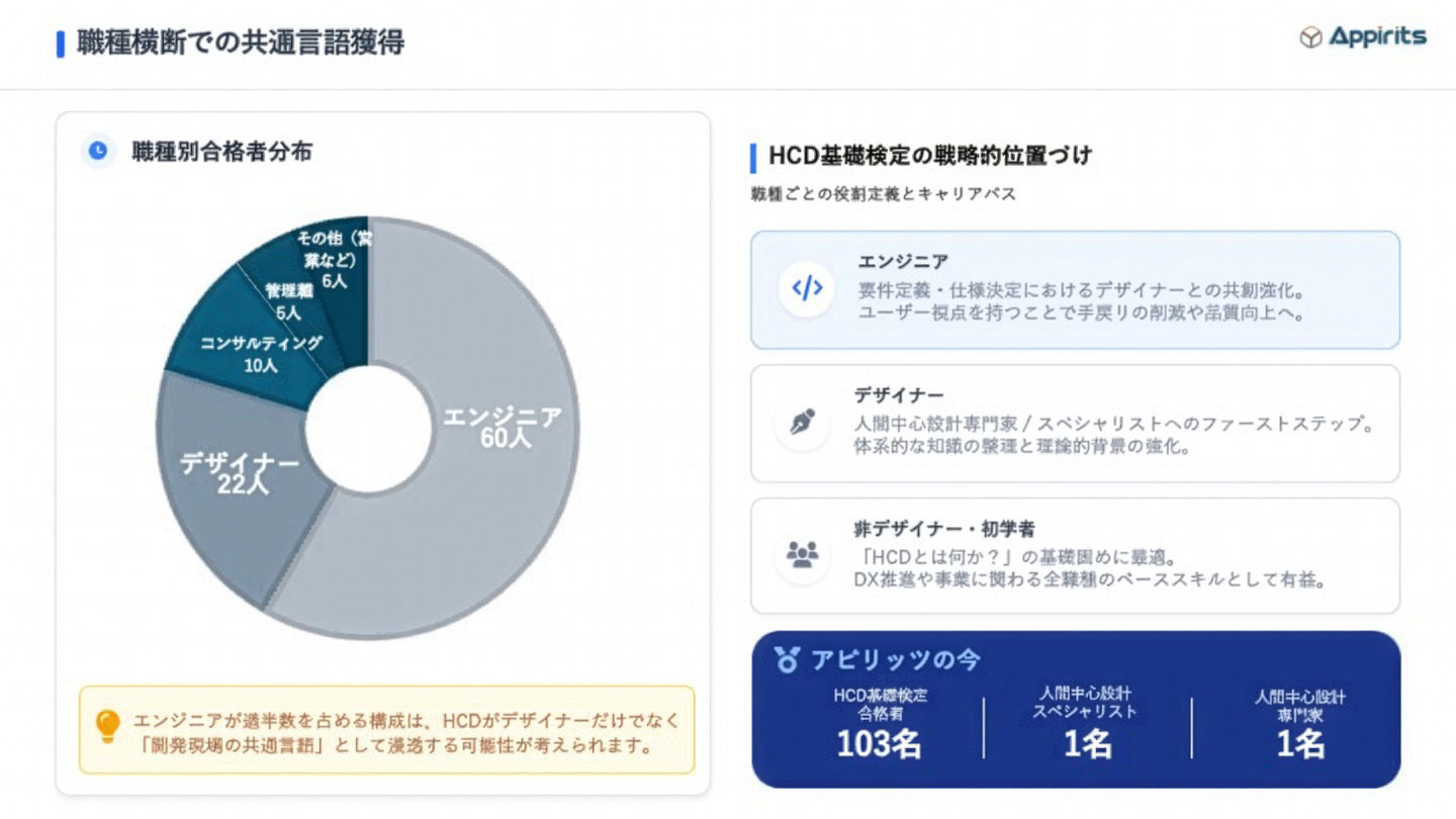 また、エンジニアの中にも「もともとこういうことを現場感覚で意識していたけれど、HCDを学んでみたら、自分の興味はまさにここだったと気づいた」という声がありました。